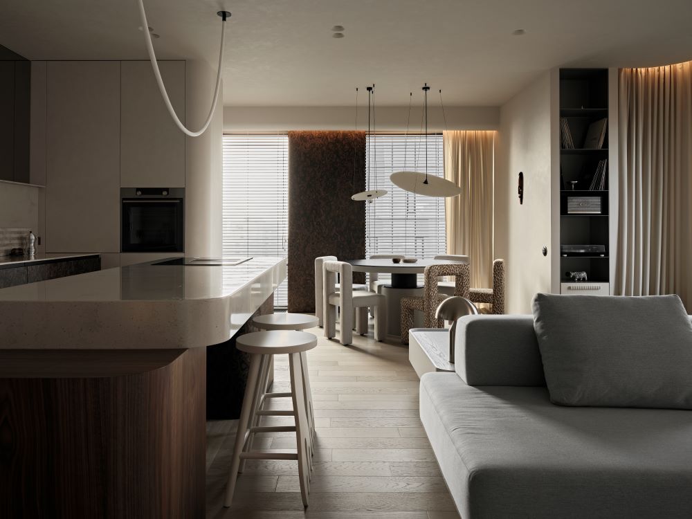 Основная задача — сохранить планировку, но полностью изменить ощущение пространства с помощью мягкой геометрии, продуманного света и правильных материалов.