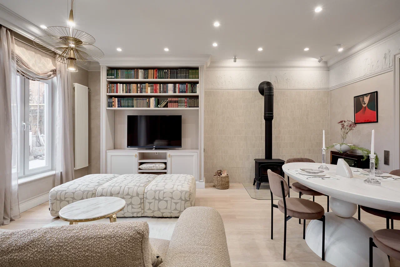 Дизайнер Игорь Куркин создал проект светлой, благородной и комфортной гостиной с камином для «Дачного ответа». Игорь сделал перенос функциональных зон, чтобы сделать новое пространство и красивым, и удобным для повседневной жизни.